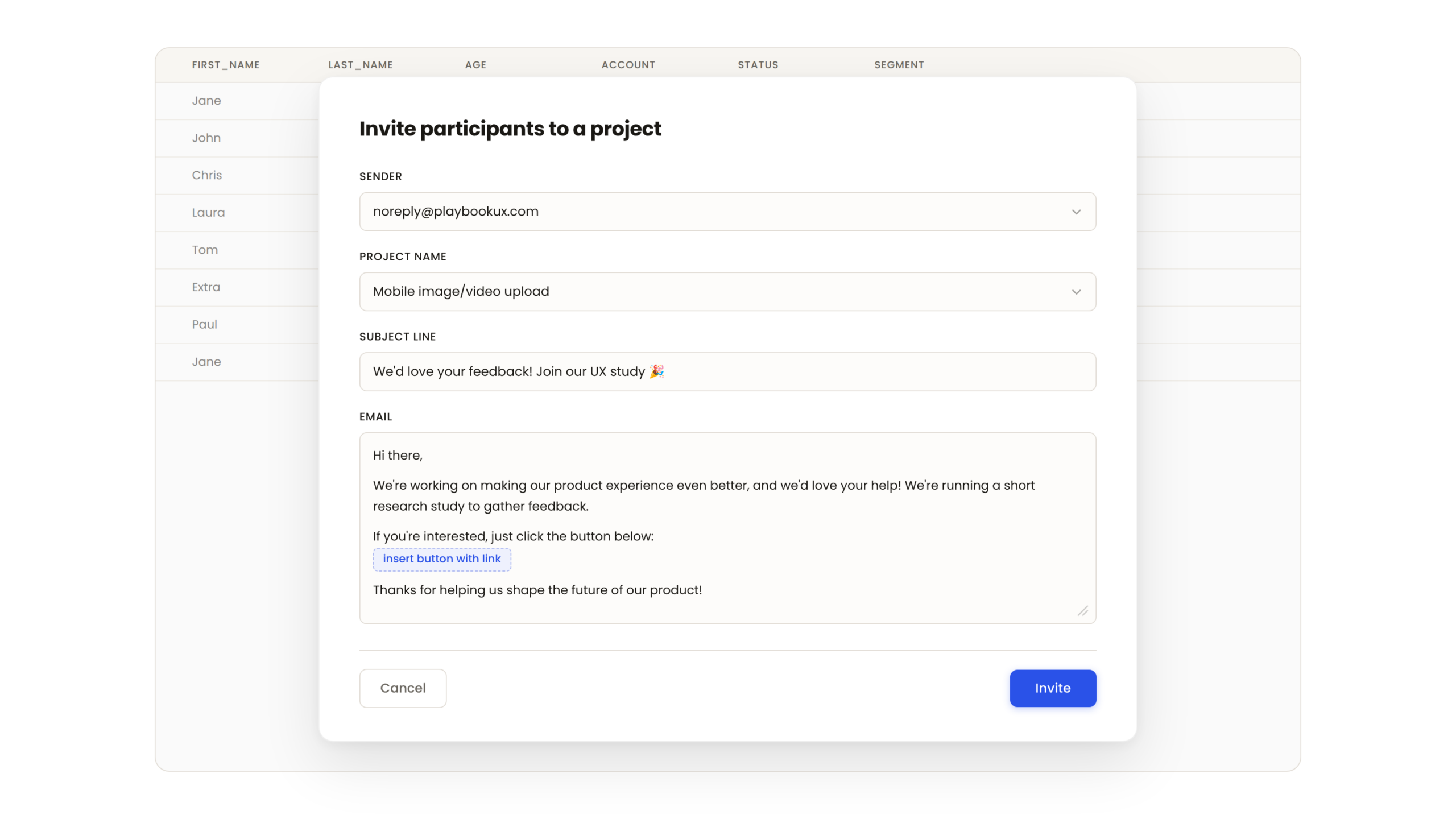 Upload your participant lists with unlimited custom attributes. No rigid schemas, no data left behind. Whether you’re tracking behavioral segments, past study participation, consent status, or niche demographic signals, every attribute is there when you need it.